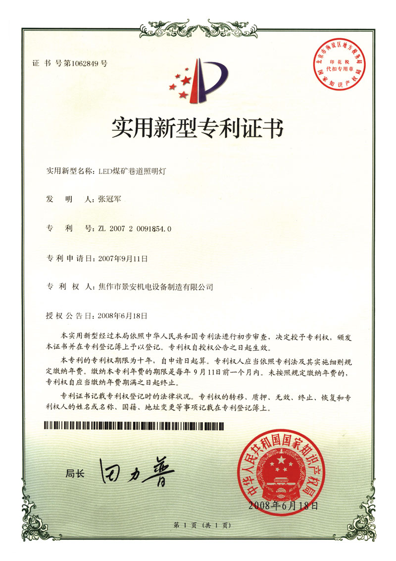 LED煤礦巷道照明燈專利證書2